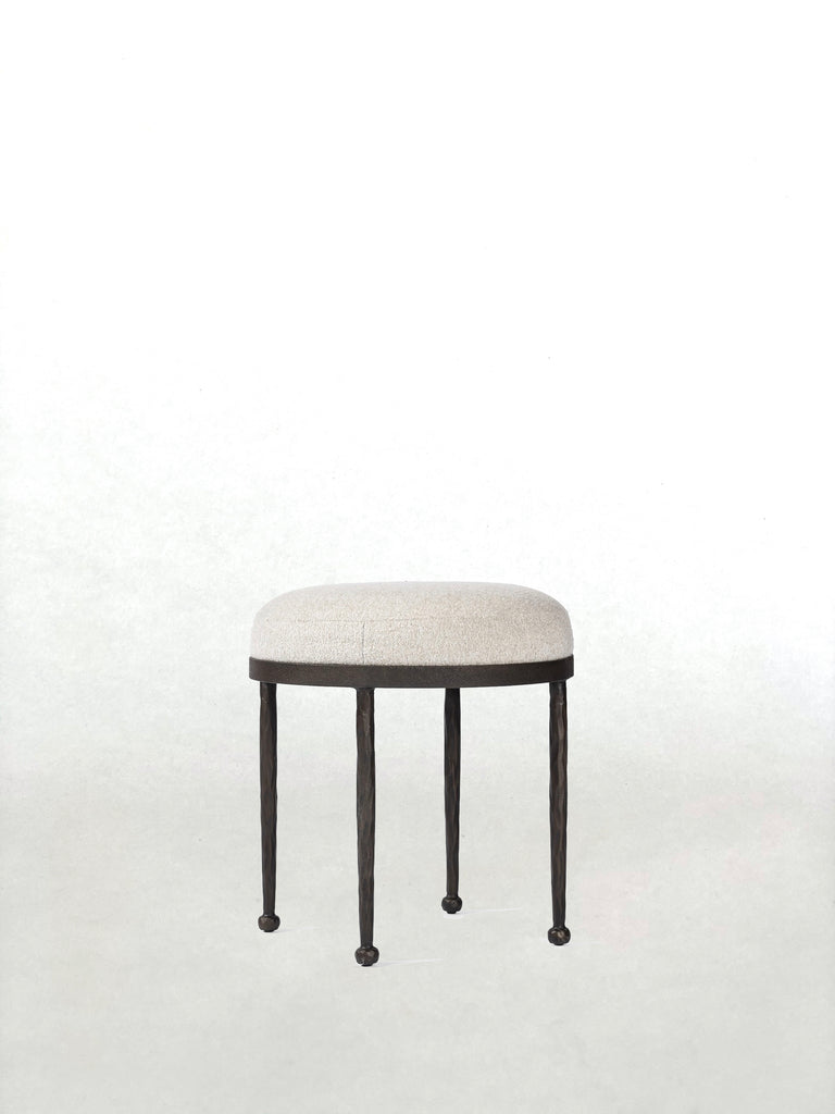 A pared-back accent stool that doubles as an ottoman. Wrough iron legs finished in a hammered bronze pair with a simple rounded seat upholstered in a texture-rich fabric, with S-spring suspension for comfort and structure.